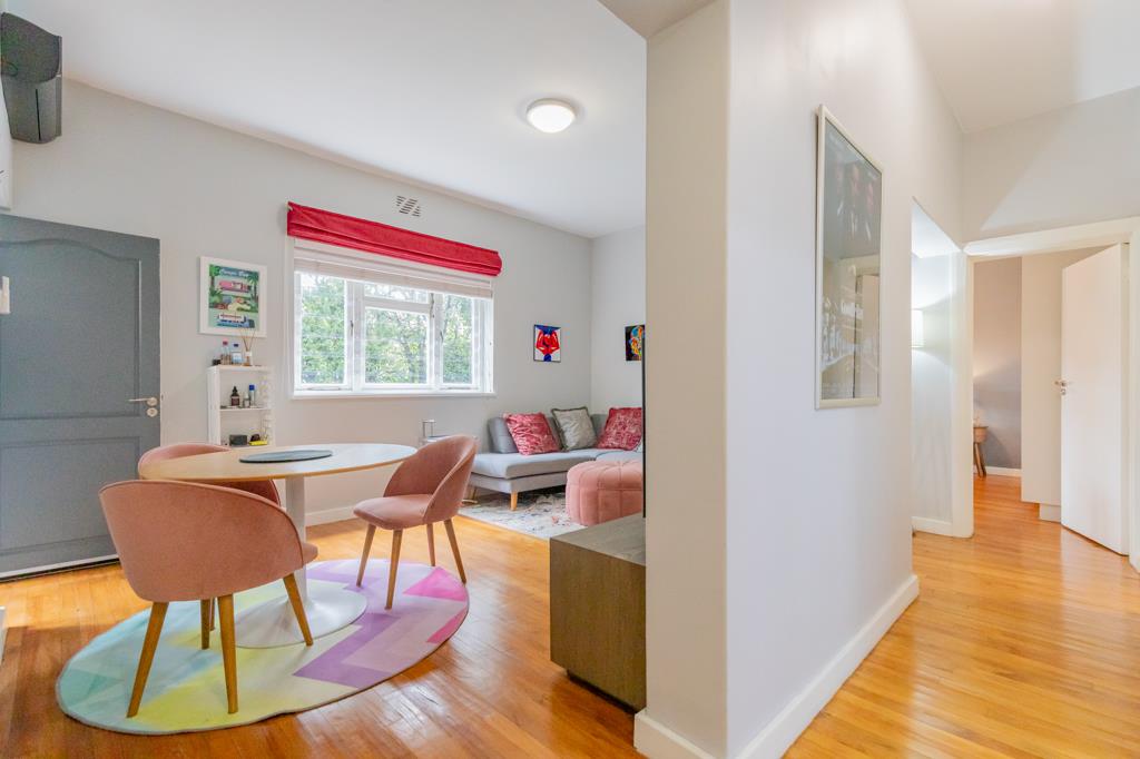 Further down the passage, the apartment opens up into a generously sized, open-plan living and dining area, thoughtfully furnished and filled with natural light. A second balcony access point here enhances the flow and provides a great space for entertaining or soaking up the fresh mountain air.
