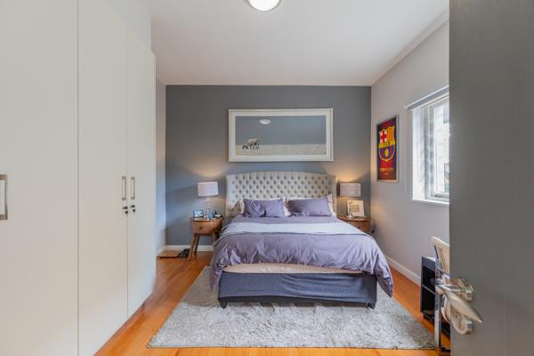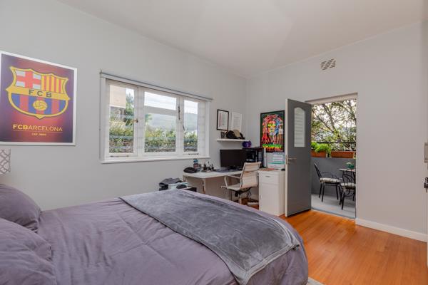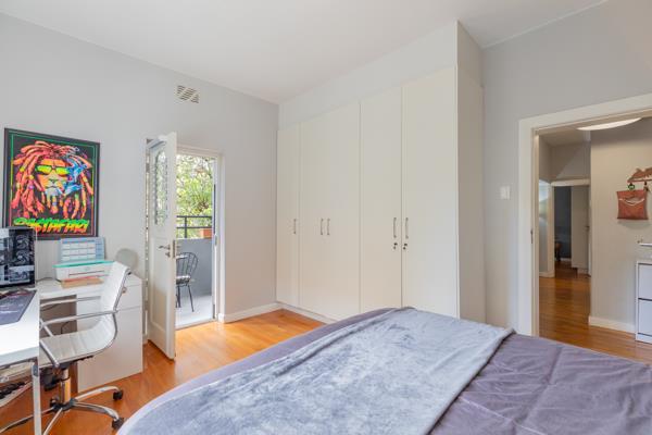 The second bedroom, also spacious and bright, features built-in cupboards and plenty of natural light, making it a versatile space for guests, a home office, or a second bedroom.