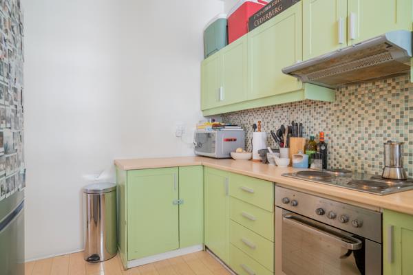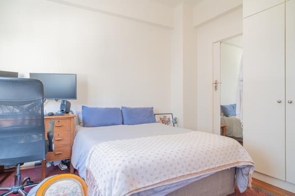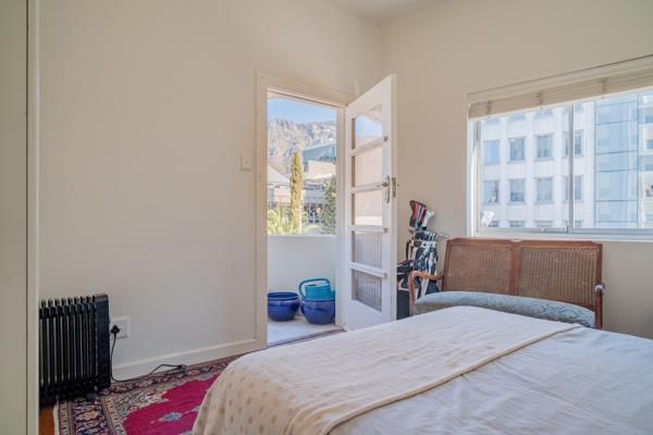 The kitchen has been refreshed with new flooring and renovated countertops, while the rest of the apartment showcases beautiful hardwood flooring that adds warmth and charm throughout. The main bedroom is spacious and opens onto a private balcony with stunning Table Mountain views, seamlessly extending into the sunlit living area. The living space is filled with natural light, features more Table Mountain vistas, and includes a built-in