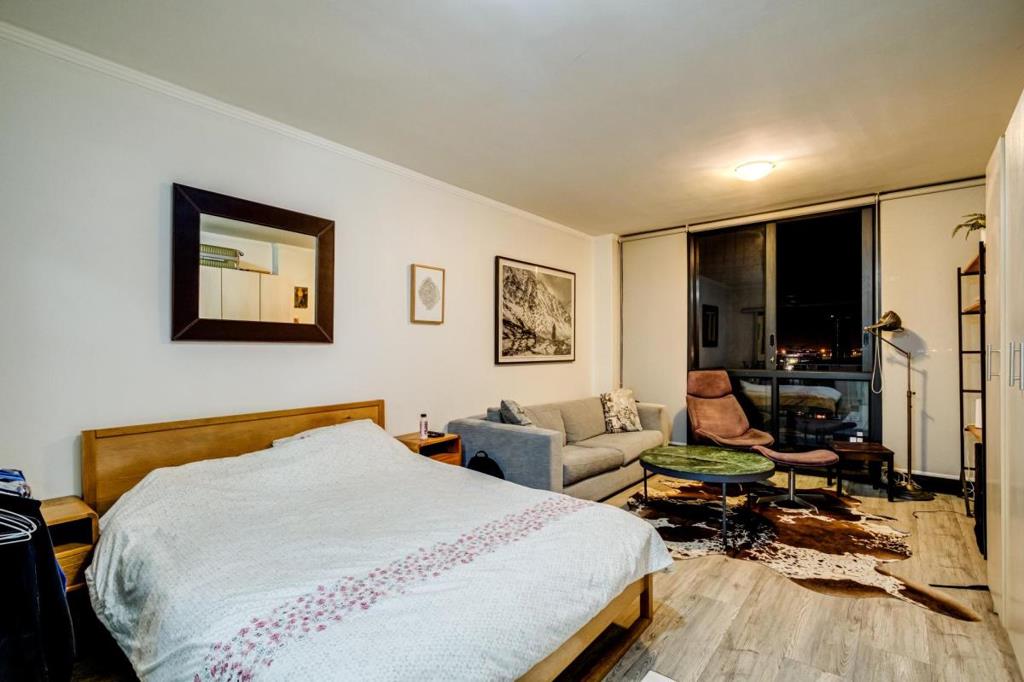 Located on the 10th floor, the apartment features an open-plan layout where a sleek galley-style kitchen flows seamlessly into the combined lounge and bedroom area. Large windows fill the space with natural light, creating an airy and inviting atmosphere. The only separate room is the modern bathroom, designed for both functionality and comfort.