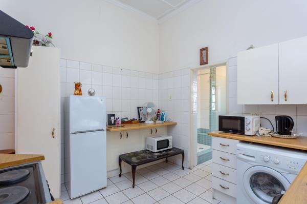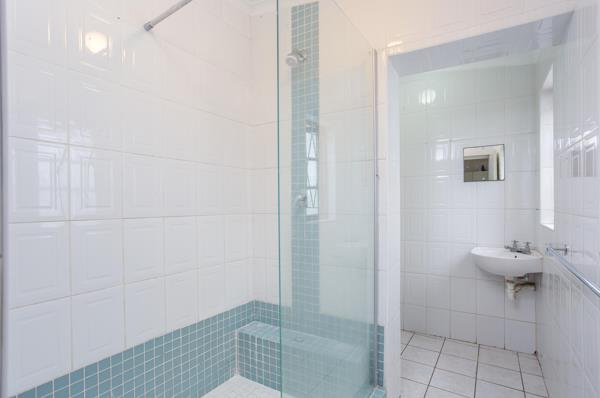 The bathroom is tiled and spacious with a shower. Space for plumbing for washing machine.