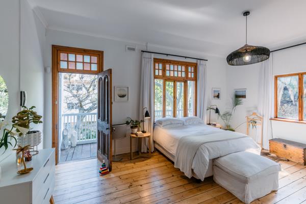Upstairs, three well-proportioned bedrooms plus a separate study provide serene accommodation, while the main bedroom enjoys direct access to a charming balcony with sweeping views of Table Mountain. A full family bathroom completes the upper level, and the leafy front stoep invites morning coffee moments or evening sundowners.