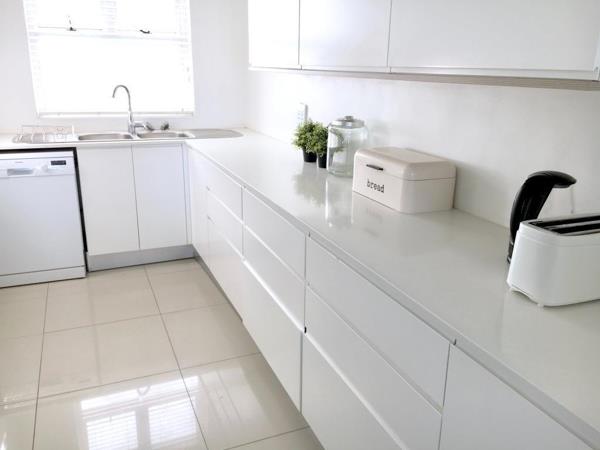 The kitchen is a chefs dream, featuring high-quality appliances including a dishwasher, fridge-freezer, oven, stove, and microwave, as well as ample counter space for meal preparation. Adjacent to the kitchen, the laundry facilities include a washing machine and tumble dryer for added convenience.