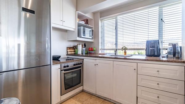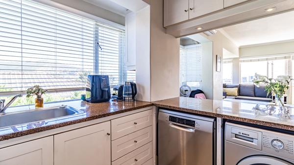 The semi-open kitchen connects neatly through a serving hatch, keeping the space sociable yet well-defined. The built-in corner seating adds both comfort and character, making the living area feel warm and inviting. From here, doors open to a north-facing balcony an ideal spot to enjoy the views stretching across Signal Hill, the city centre, the harbour and up to Devils Peak. A real treat for sundowners, admiring the city lights at night and watching the fog surrounds the CBD towers as it enters from Table Bay.