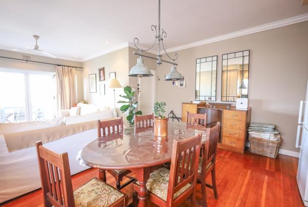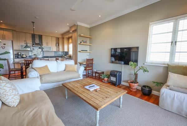 The open-plan kitchen features ample built in cupboards, an oven and stovetop, sink, and plumbing points for both a dishwasher and washing machine. This flows seamlessly into the dining area and a spacious lounge, complete with a ceiling fan for added comfort.