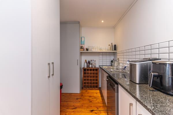 The first floor flows nicely from a well-appointed kitchen through an open plan living room and dining area through to a back garden with a built-in braai and a small lawn. Behind the kitchen, a scullery will hide the dishes and leftovers from the inevitable parties which will happen here.