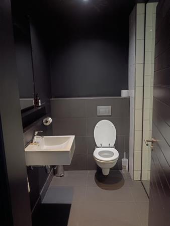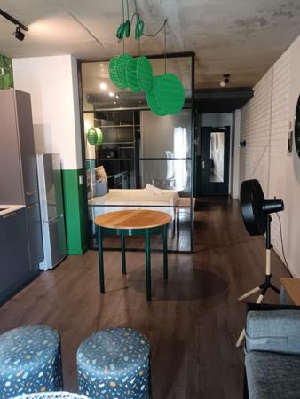 The apartment features a bright, open-plan living space with a comfortable lounge, soundproof windows, and a sleek flat-screen TV with satellite channels. A dedicated workspace and modern bathroom with a walk-in shower add to the functionality of this urban retreat.