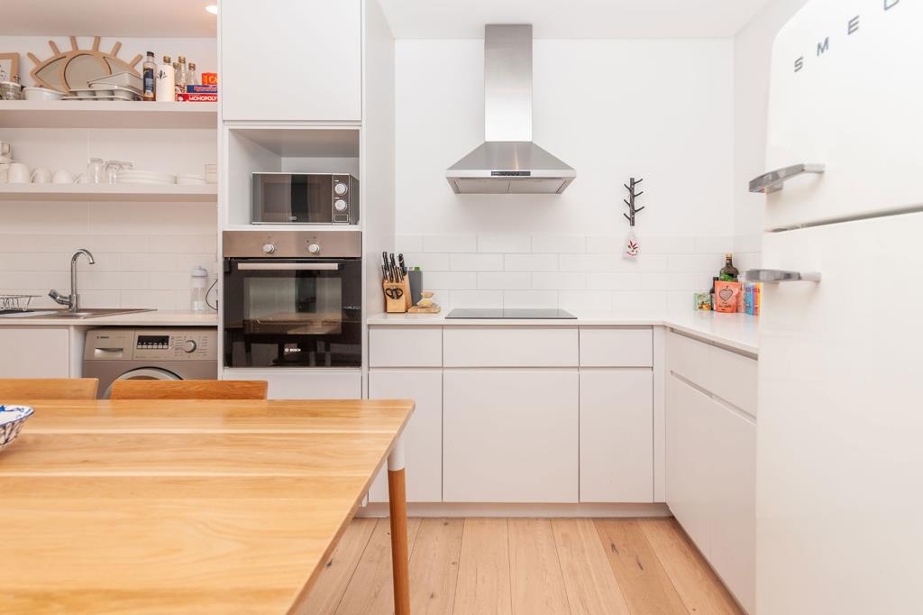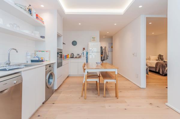 Open plan living room and kitchen complete with Oggie hardwood flooring and underfloor heating throughout and air-conditioning. Two large windows with floating desk work area overlooking the Table Bay & Harbour.