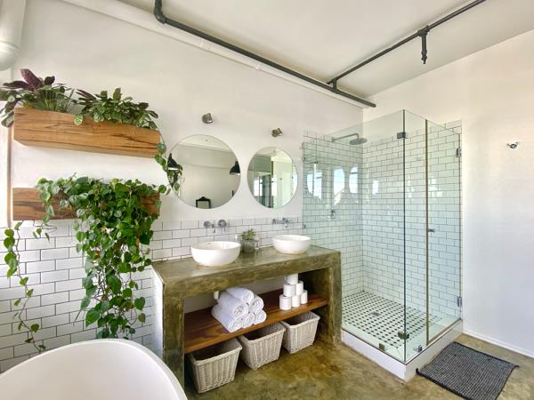 Stunning open plan bathroom with his and her sinks, spacious shower, bathtub and private toilet /guest loo.