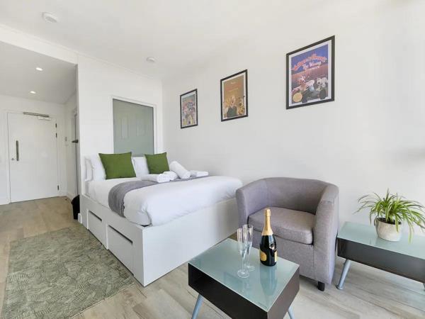 The studio apartment is tastefully decorated, with a walk out balcony, It has a double bed and a work desk with access to fast wifi. It also has a well equipped kitchen for any meals you will need to cook.