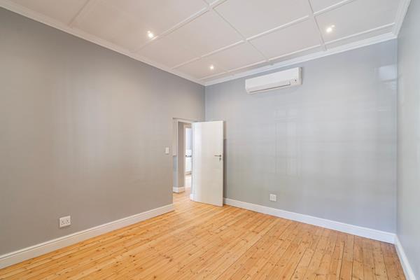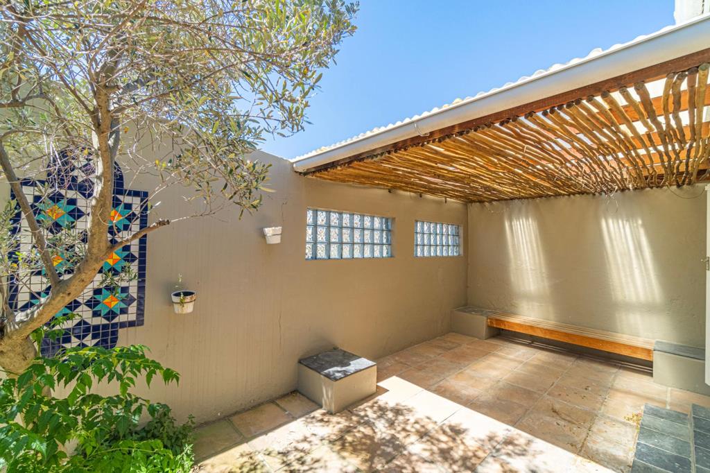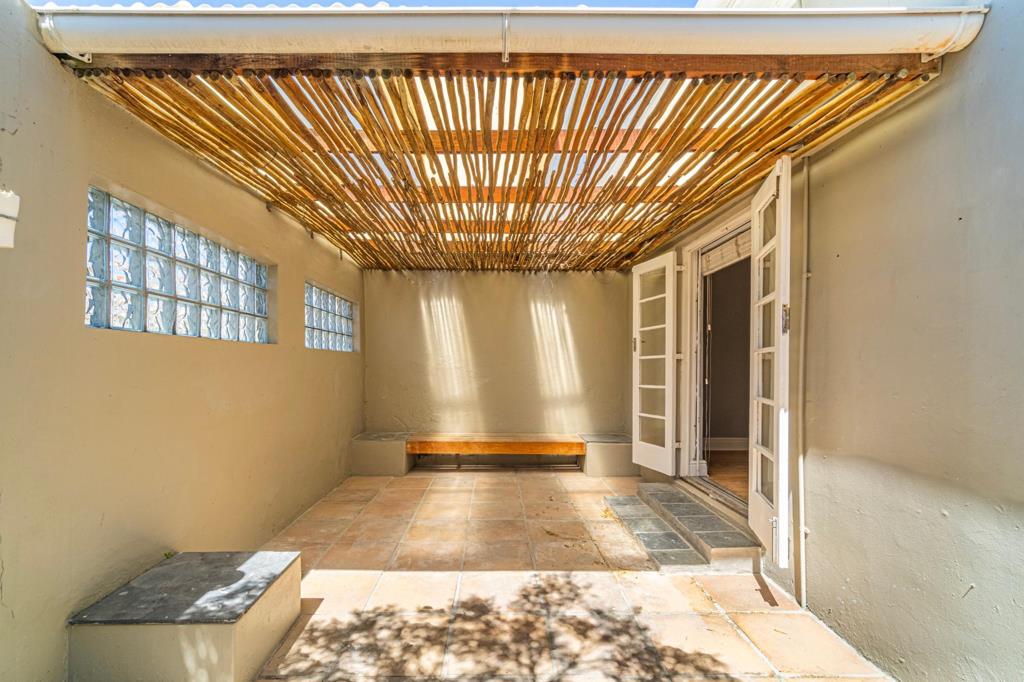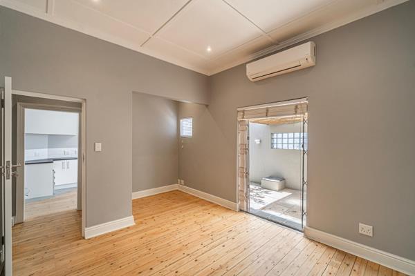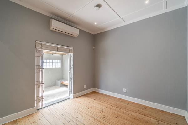 Both bedrooms are well-sized and air-conditioned, offering comfort year-round. The back bedroom enjoys French double doors that open directly onto a private, paved courtyard a peaceful outdoor retreat shared with the kitchen, ideal for morning coffee or quiet evening gatherings.