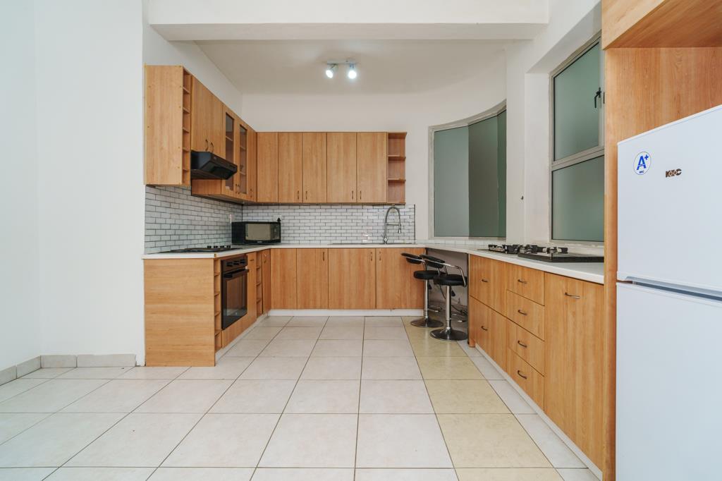 Turning right leads you into the spacious kitchen, which boasts ample cupboard space, a built-in oven, hob, and extractor fan - ideal for those who enjoy cooking and entertaining. Beyond the kitchen, youll find two well-sized bedrooms, both complete with built-in cupboards and filled with natural light, creating a warm and inviting atmosphere.