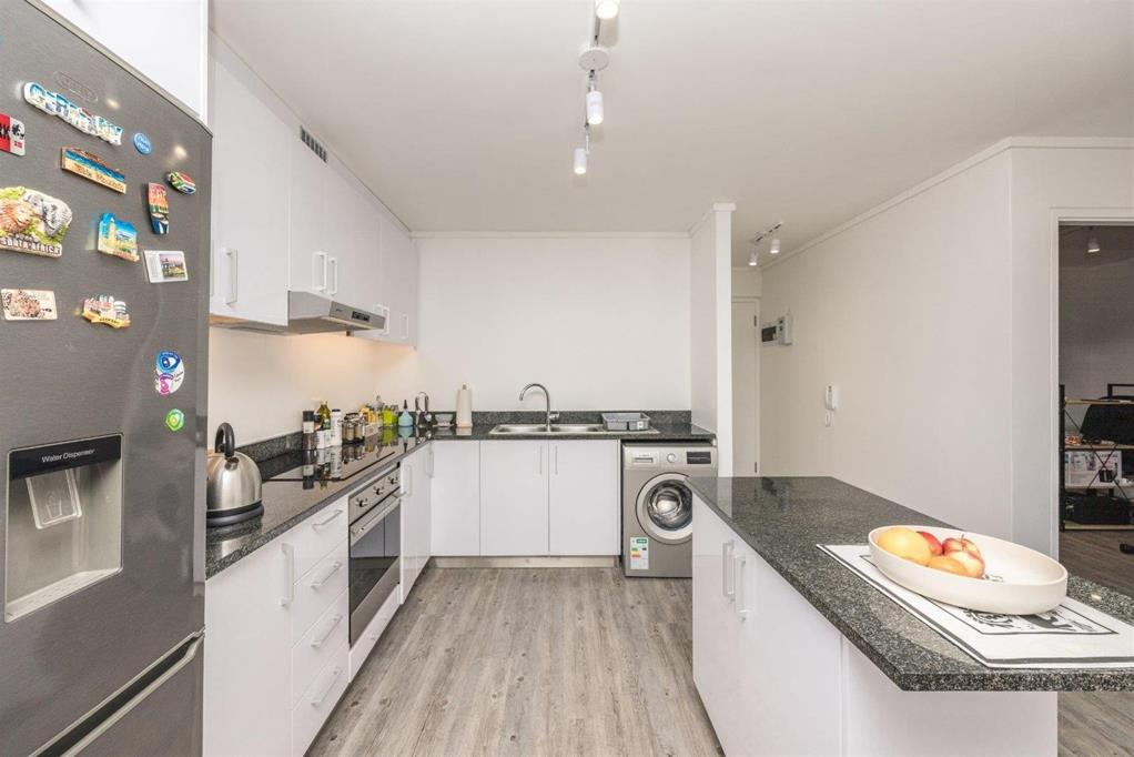 Walking in the front door we are greeted with an open plan kitchen and lounge area. The kitchen has a granite topped center island with built in cupboards and Smeg Appliances so you cook in style.
