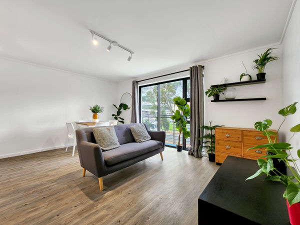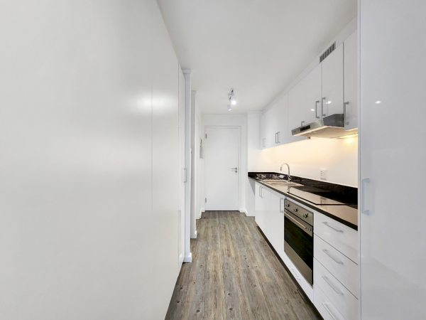 The open plan galley kitchen (SMEG hob & oven) leads to the large open plan living room and dining room which benefits from lots of natural light due to the large sliding door with Juliette balcony. Magnificent views! The bedroom is at the rear of the property with ample built-in cupboards. Generous bathroom with large frameless glass shower, single vanity and toilet.