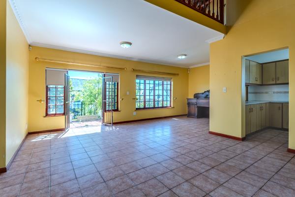 The open-plan lounge and dining room downstairs open up through French doors to the back patio, creating an inviting space for relaxation and gatherings. Upstairs, another spacious living area leads to a balcony that offers stunning views. This area currently also features built-in cupboards and desks, making it ideal for use as a workroom or study.
