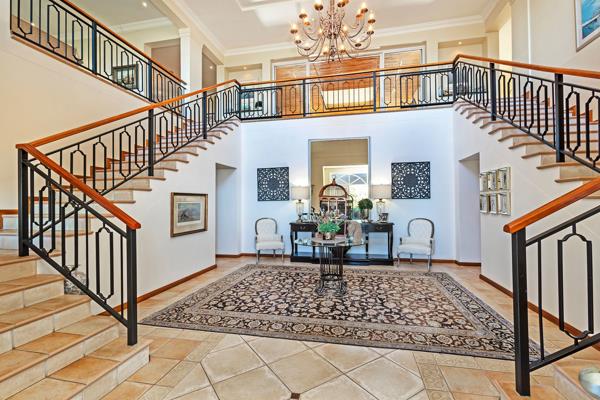 The design impresses with high ceilings, bespoke cabinetry, and offers a welcoming grand entrance featuring a water feature, as well as an impressive double-volume entrance hall with two eye-catching staircases. The family home offers a large office with ample built-in cupboards and an elegant guest cloakroom downstairs, which can easily be converted into a guest suite as well.