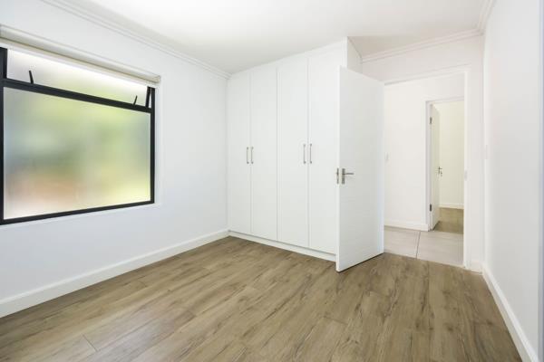 Two spacious bedrooms, including one en-suite, each fitted with built-in cupboards and contemporary flooring