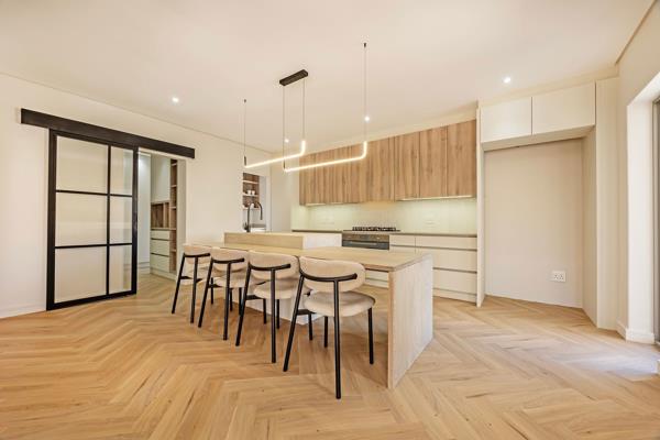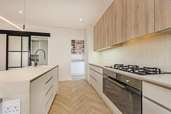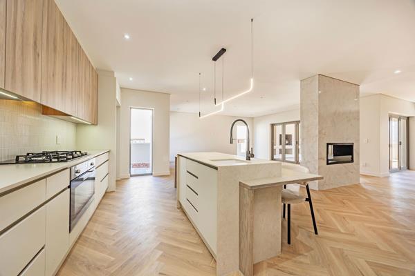 The gas fireplace in the centre of the living area and kitchen, has been cladded with bespoke Neolith. The porcelain centre island in the kitchen is a combination of solid oak and porcelain that is also from the Neolith range. The design and finishes of the kitchen is a delight with an open walk in pantry and spacious scullerylaundry.