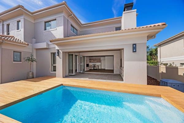 Stacking doors in the dining room and lounge opens up to the covered braai area with designer lighting, as well as the sparkling pool area with its attractive Grappa wooden deck.