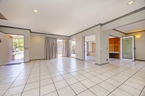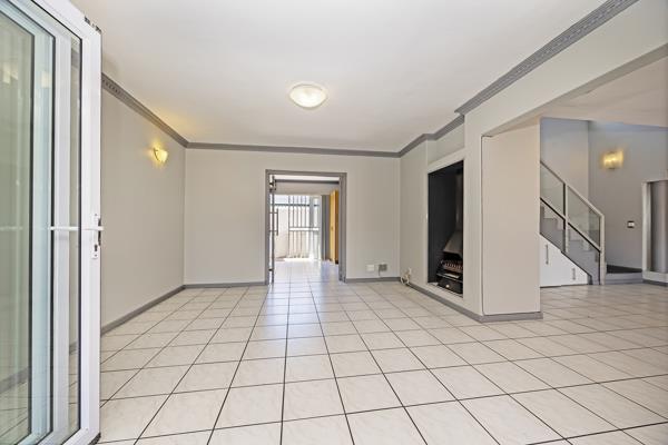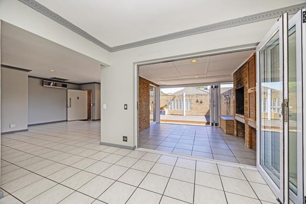 The ultimate entertaining area features a dedicated Inside braai area, an indoor fireplace, and a bar area that opens onto a paved outdoor space.