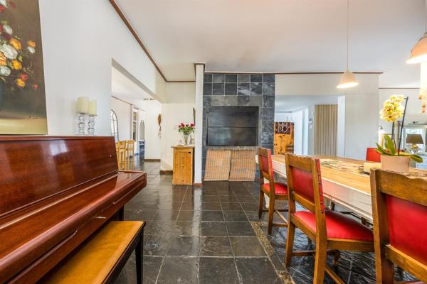 Heart-of-the-home open-plan living: Kitchen with separate scullery flows into dining, indoor braai, cozy TV room & elegant lounge