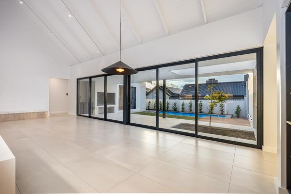 * Palace sliding doors lead to a covered patio with a built-in braai, overlooking a sparkling pool and irrigated garden ideal for entertaining.