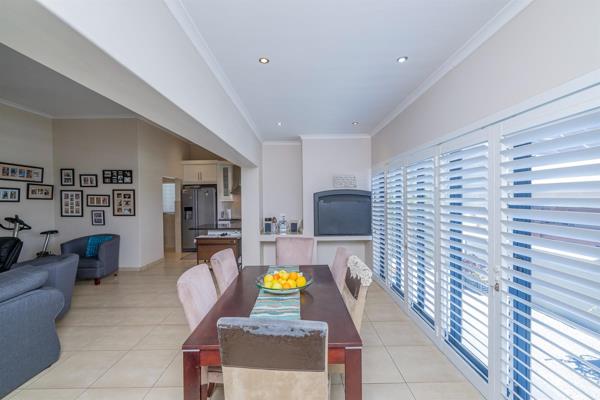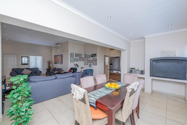 The heart of this home is its expansive open-plan living area with high ceilings, filled with natural light and contemporary charm. The lounge offers a relaxed space for family gatherings, while the dining/braai room complete with a built-in braai, aluminium stacker doors, and American shutters flows effortlessly to a private, low-maintenance garden, ideal for entertaining or quiet outdoor enjoyment.