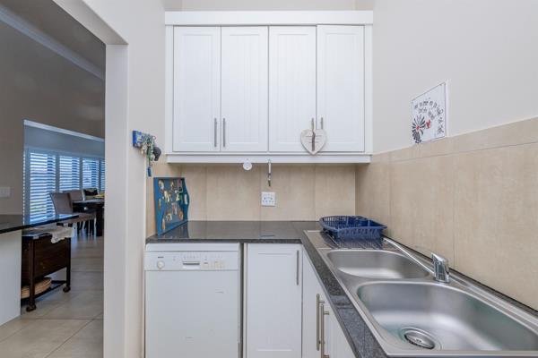 The modern kitchen impresses with its white cabinetry, granite tops, and breakfast counter, complemented by an adjoining scullery fitted with additional cabinetry, double zinc, and an appliance point.