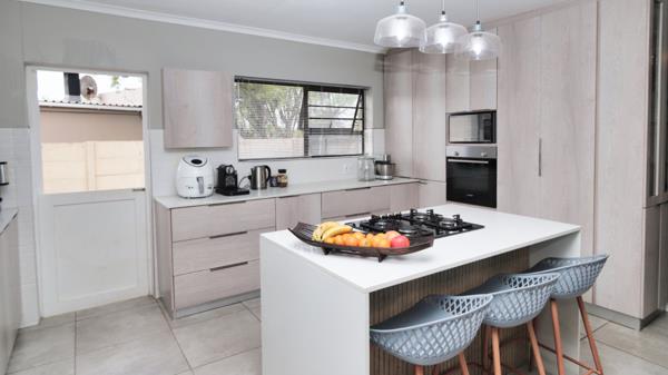 The open-plan lounge and dining area creates an inviting atmosphere, with air-conditioning ensuring year-round comfort. Flowing seamlessly into the newly renovated kitchen, this is the heart of the home, featuring Caesarstone countertops, a centre island, modern appliances and ample cupboard space.
