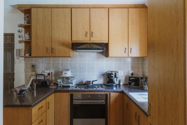 with air conditioner. A modern kitchen with ample cupboards, gas hob, electric oven &