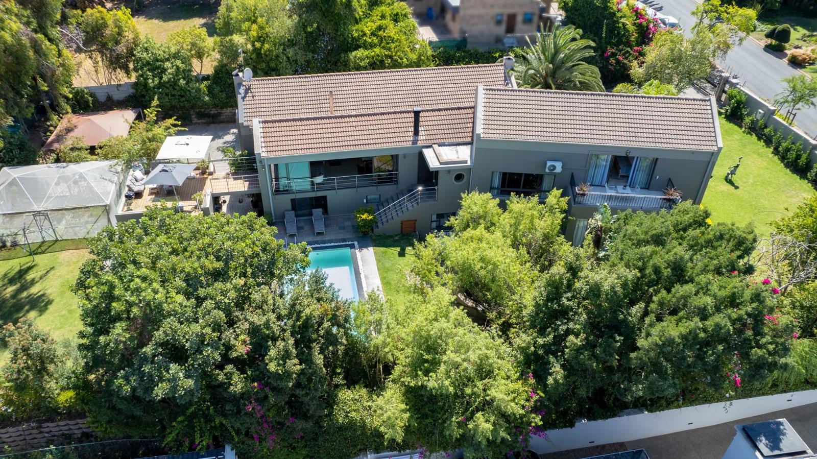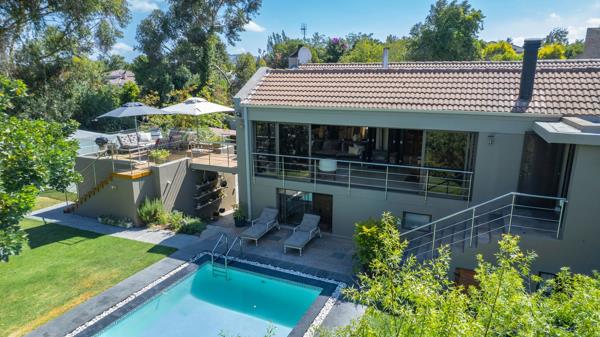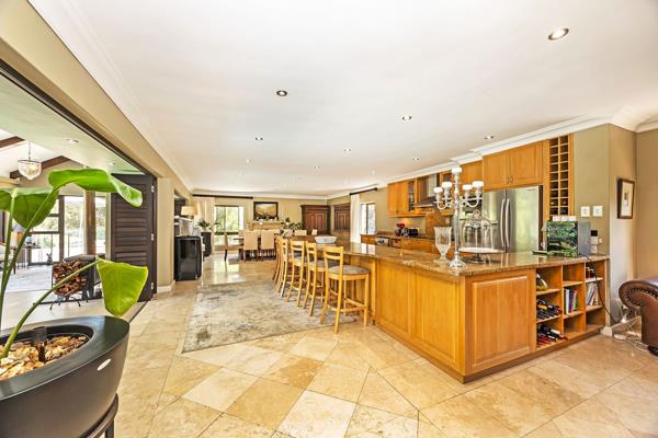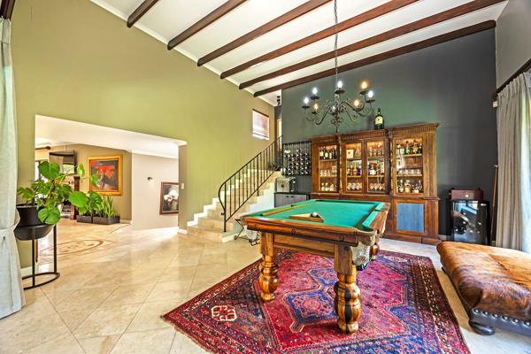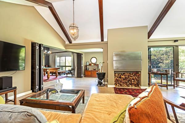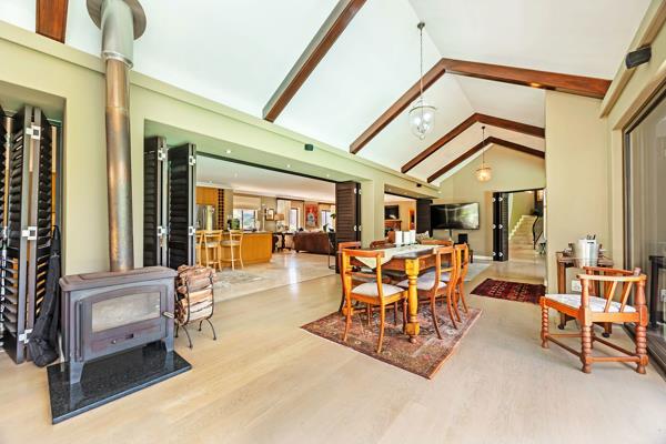 Great options of working from home/dual living. Enchanting large open-plan living areas with 2 gas fireplaces leading to another extra-large open-plan living area with an indoor braai, combustion fireplace, with engineered wooden floors and American shutters, which can be utilized to create separate living areas. This lovely informal living area has multiple sliding doors overlooking sparkling pool, koi pond and well-manicured garden, as well as leading to wooden deck which creates a tranquil feeling for outside entertainment.
