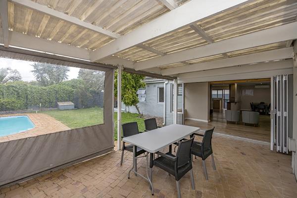The light-filled living and dining area features two lounges and a cosy Jetmaster fireplace, seamlessly opening onto an enclosed patio with a built-in braai, ideal for year round entertaining.