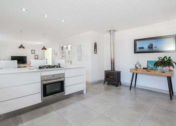 The open-plan kitchen flows seamlessly into the lounge and braai room, creating an ideal space for entertaining. Stacker doors open onto a private garden featuring a pool and pizza ovenperfect for relaxed outdoor living.