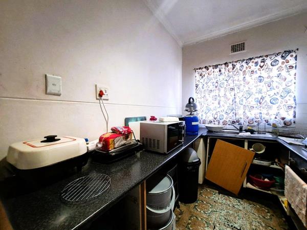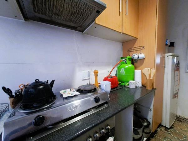 The kitchen is fitted with built-in cupboards, a built-in oven, hob, and extractor fan, along with a serving hatch to the lounge, making it both practical and functional.
