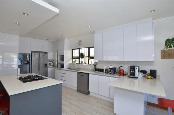 The open-plan living and entertainment areas are a highlight of the home, filled with natural light and offering seamless indoor-outdoor flow. The kitchen is modern and spacious, featuring Caesarstone countertops, a centre cooking island with built-in gas hob, high-gloss cabinetry, soft-close cupboards, double-door fridge cavity, built-in microwave and oven space, large prep counters, dishwasher space and LED downlighting. Its the perfect space for cooking and entertaining.