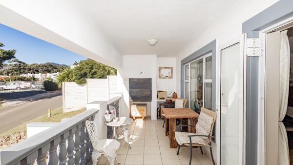 A spacious open-plan living and dining area features a wood-burning fireplace and two air conditioners, ensuring year-round comfort. Two sets of glass doors lead out to a balcony with a built-in braaian ideal setting to enjoy the spectacular vistas with family and friends.