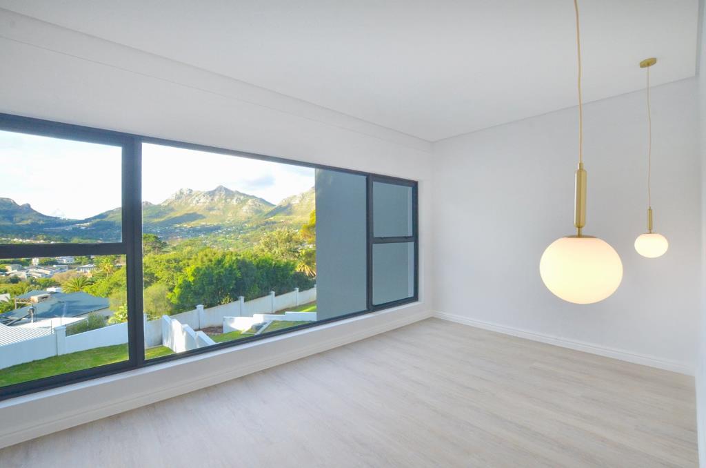 Upstairs, natural light pours through a double-volume window, framing peaceful mountain and valley views. Here youll find two airy bedrooms, a spacious family bathroom with a freestanding tub and a cosy pyjama lounge, the perfect spot to unwind or read at the end of a long day. The luxurious primary suite crowns the upper level with its spacious and tranquil feel, complemented perfectly by views of the Constantiaberg range. A walk-in wardrobe, and an en-suite bathroom featuring a double vanity and double shower are also other notable features. A versatile guest bedroom or home office, with a stylish guest bathroom alongside, completes the flexible layout for modern family living or visiting friends.