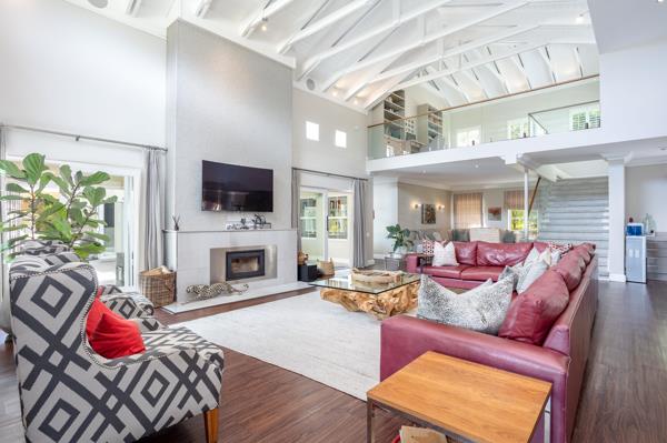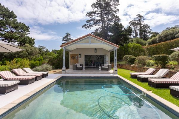 The expansive dining area, complete with a built-in braai, opens seamlessly to an impressive outdoor patio, creating an exceptional indoor-outdoor flow. The large, heated swimming pool and pool house are surrounded by lush, landscaped gardens on 2,200m2 of land, serviced by a well point for irrigation.