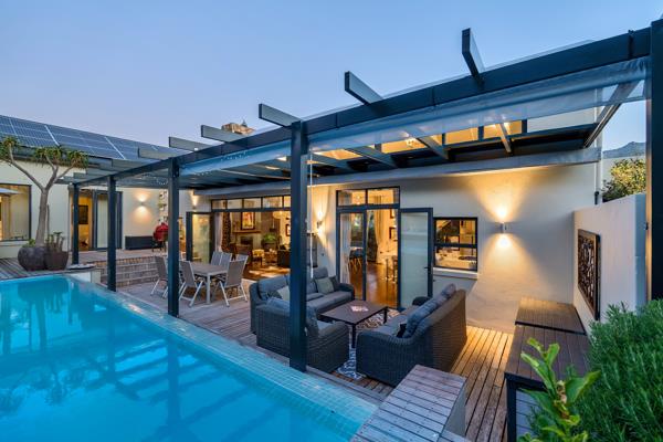 Designed with both family comfort and sophisticated entertaining in mind, the home features four to five bedrooms, four bathrooms, a studio, TVplayroom and a mezzanine home office. The expansive double-volume living area incorporating lounge, dining and kitchen seamlessly flows to a generous outdoor living terrace designed for alfresco dining and lounging. A rim-flow pool, pergola and sun awning create the ideal setting to unwind under the stars and take in the breathtaking views of the Little Lions Head silhouette.