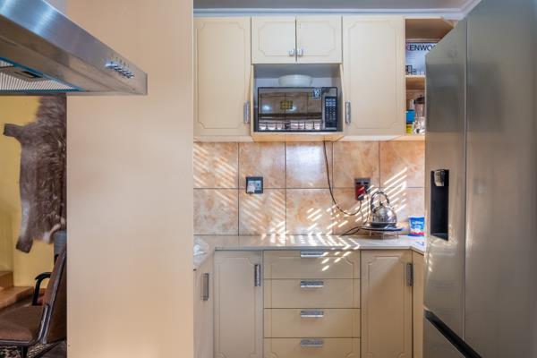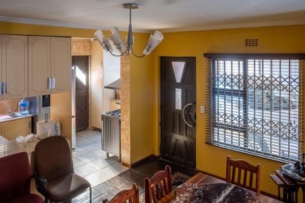Welcoming dining area leading into a functional, well-appointed kitchen with built-in cupboards