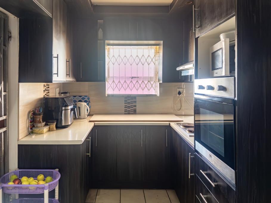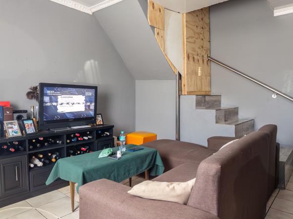 Upstairs, the home continues to impress with a comfortable lounge area and 2 bedrooms, including a main bedroom with an open en-suite. The floors are fully laminated, and the staircase leading up is neatly tiled. A small kitchenette has been added, enhancing the independent living potential of this level.