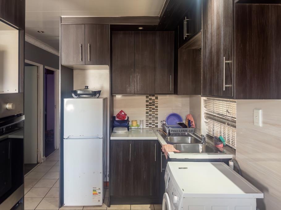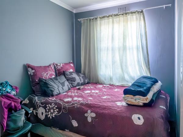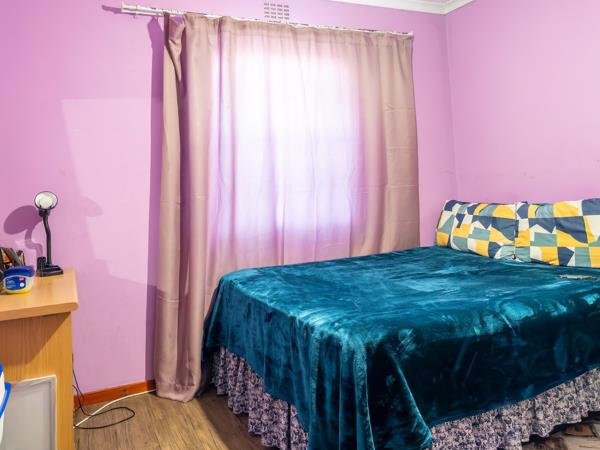 Three well-sized bedrooms are serviced by a bathroom equipped with a bath, toilet, and basin. The space is finished with tiled flooring throughout, while the bedrooms offer laminated floors, and aluminium windows ensure durability and low maintenance.