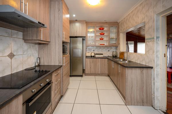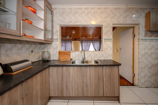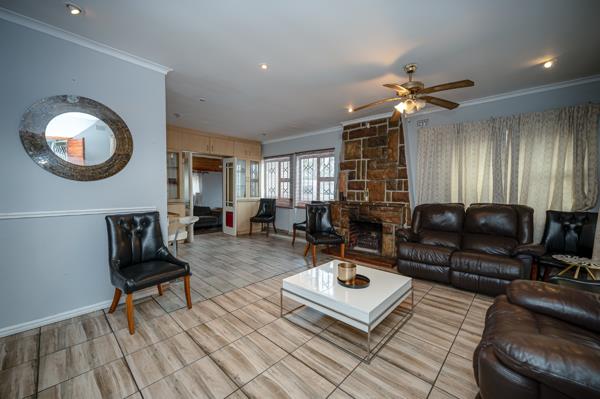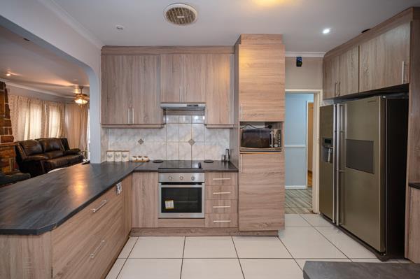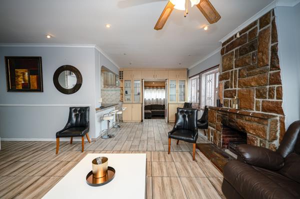 This home offers a spacious lounge with tiled flooring, downlights and an indoor fireplace perfect for those cold winter nights. The lounge flows effortlessly to the dining area which is open-plan to the kitchen. The modern kitchen features light wood cupboards, a fitted stove and oven, space for a double-door fridge, and a charming breakfast countertop. There is a separate TV room with direct access to an additional indoor room that can be used as an entertainment area.