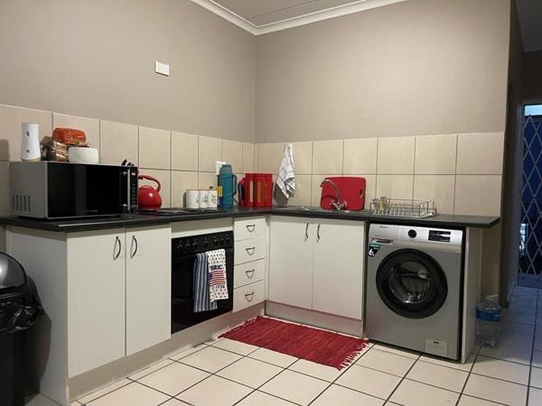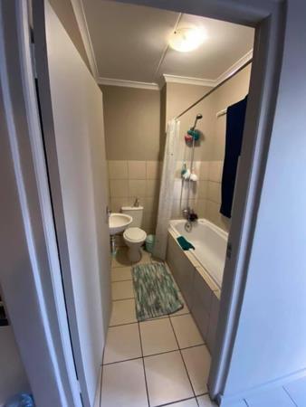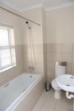 Bathroom consists of a shower in the bath, with toilet and basin.