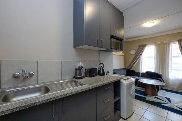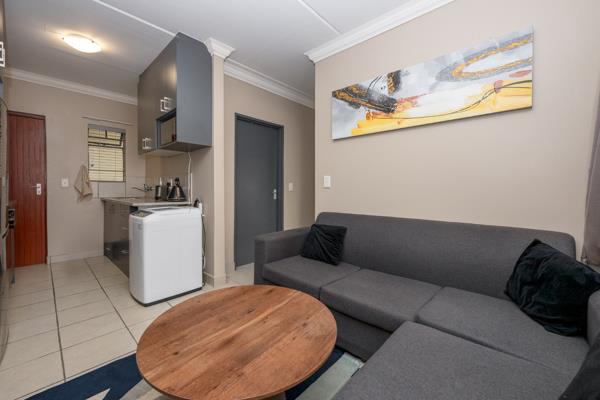 The lounge creates a welcoming space to unwind or entertain, with easy access to the rest of the home. The charming kitchen features ample cupboard space, an under-counter oven and hob, a plumbing point, and space for a fridge.