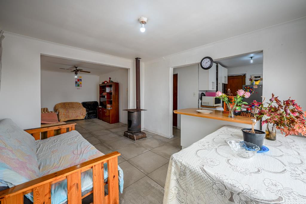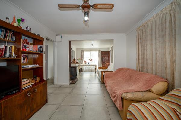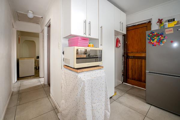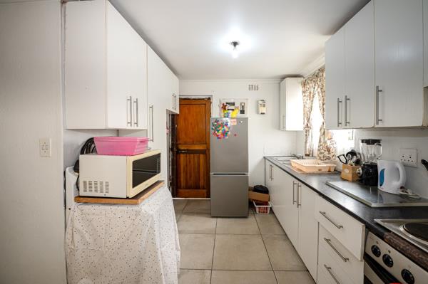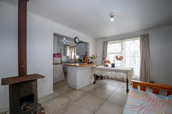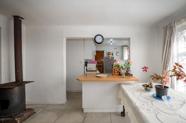 The fully enclosed property welcomes you with a spacious open-plan lounge, dining area and fully fitted kitchen. The lounge features tiled flooring, a ceiling fan, and a large window, allowing natural sunlight to flood the room. The dining room includes an indoor fireplace, perfect for those chilly winter evenings. The kitchen is equipped with modern built-in cupboards, an under-counter oven and hob and a breakfast countertop.