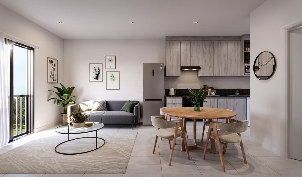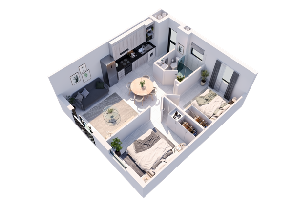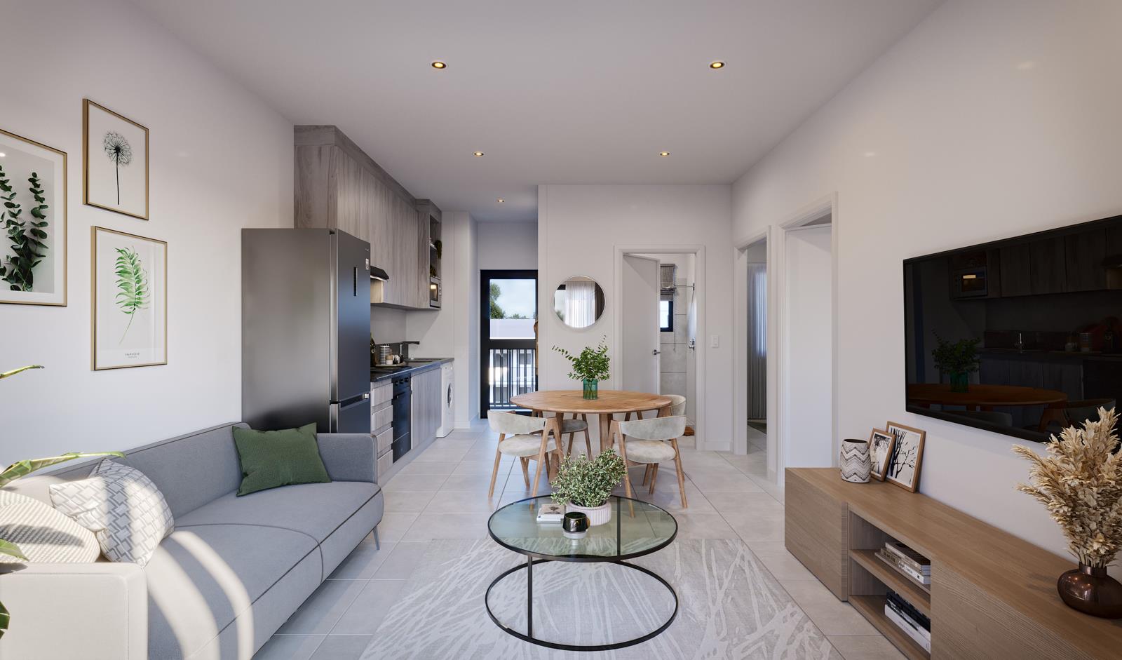 Each apartment features a spacious open-plan layout, seamlessly integrating the kitchen and living area to create a welcoming space for both relaxation and entertaining. The kitchens are thoughtfully fitted, while the lounge areas are light and inviting. A sleek, modern bathroom completes each unit, ensuring a comfortable and functional living environment.