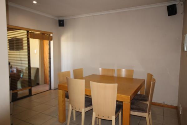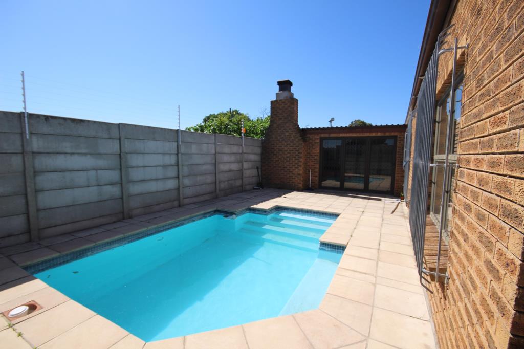 The interior boasts three bedrooms, a dedicated study which can also be converted into a 4th bedroom, and three bathrooms. The heart of the home is the open-plan kitchen and living room, which is ideal for entertaining. It includes a braai in the dining room plus a separate braaifamily room leading out to a beautiful sparkling pool with stackable patio doors creating the perfect gathering for family and friends.