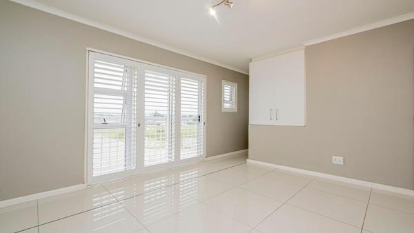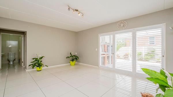 The open-plan kitchen is both stylish and practical, featuring ample cupboard space, granite countertops, and seamless flow to the lounge area. Sliding doors with American Shutters open onto a private outdoor area complete with a built-in braai and small, low-maintenance garden perfect for relaxed entertaining.