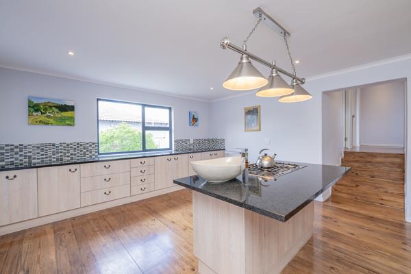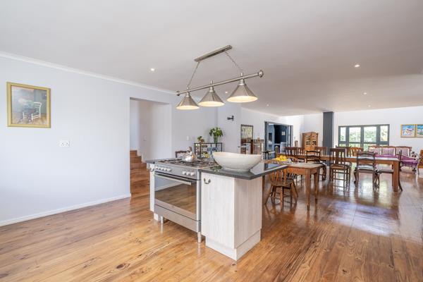 Open plan kitchen fitted with BICs 5 burner gas stove, oven, scullery and walk-in pantry.